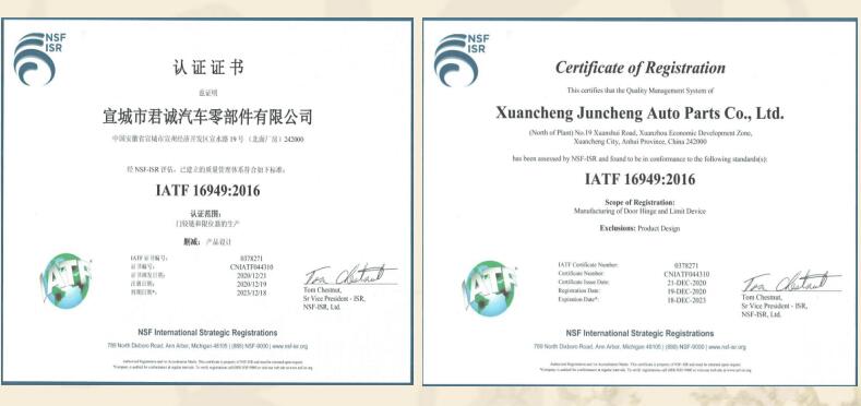 宣城市君誠汽車零部件有限公司是專業(yè)生產(chǎn)各類汽車鉸鏈及限位器的民營企業(yè),總投資3000余萬元,位于宣城高新技術(shù)產(chǎn)業(yè)開發(fā)區(qū),緊鄰宣廣、宣蕪高速公路,地理位置優(yōu)越,交通便捷。是“國家高新技術(shù)企業(yè)、知識產(chǎn)權(quán)貫標(biāo)企業(yè)、安徽省商標(biāo)示范企業(yè)、安徽省科技型企業(yè)”,已獲得國家發(fā)明專利18項,實用新型發(fā)明專利4項。主要從事各類汽車門鉸鏈及限位器的設(shè)計、研發(fā)、生產(chǎn)、和銷售,具有專業(yè)的合作團隊。自2015年正式生產(chǎn)至今,已形成一整套完整的生產(chǎn)、質(zhì)量管理體系。并已通過國家強制性產(chǎn)品認證“3C”體系認證及IATF16949國際質(zhì)量體系認證。 在生產(chǎn)設(shè)備上,公司擁... 【查看詳細】